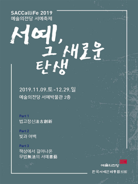 SACCalliFe 2019 예술의전당 서예축제서예, 그 새로운 탄생-기간 : 2019.11.09(토) ~ 2019.12.29(일)시간 : 11:00-19:0…