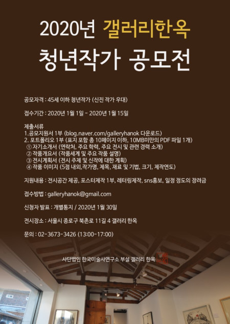 2020년 갤러리한옥 청년작가 공모전-(사)한국미술사연구소 부설 갤러리 한옥에서 제2회 청년작가 공모전을 개최합니다.자세한 내용은 링크를 확인하세요.