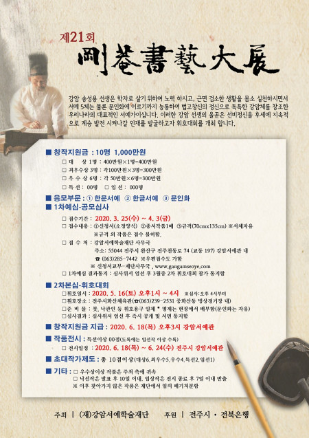 제21회 강암서예대전1. 창작지원금 : 10명 1,000만원대 상 1명 : 400만원 ✕ 1명 = 400만원최우수상 3명 : 각100만원 ✕ 3명 = 300만원…