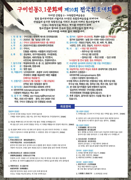 구미인동3.1문화제 제10회 전국휘호대회일시 : 2020. 3. 1(일) 오후 1시30분장소 : 구미시 강동문화복지회관 1층 체육관주최 : 2020구미인동3.1…