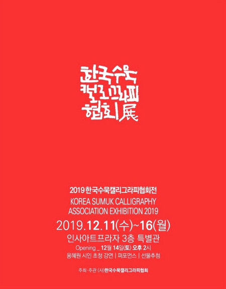한국수묵캘리그라피협회전기간 : 2019.12.11(수) ~ 12.16(월)인사아트프라자 3층 특별관