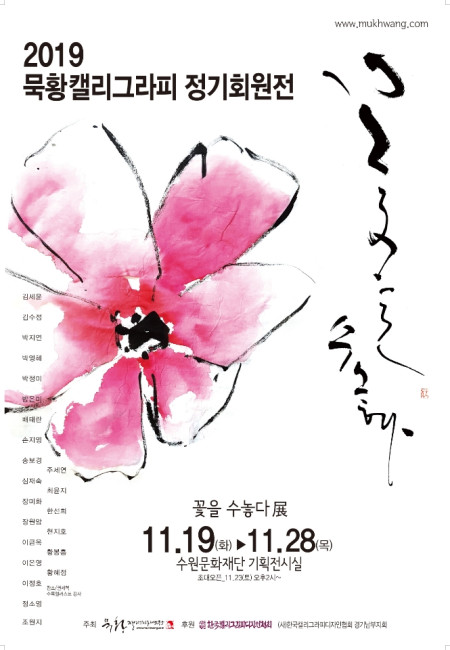2019묵황캘리그라피 정기회원전<꽃을 수놓다>전시: 2019. 11.19(화)~11.28(목)장소: 수원문화재단 기획전시실초대: 11. 23(토) …