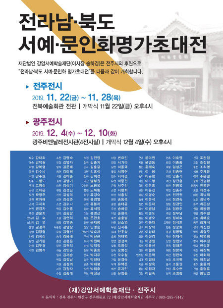 전라남·북도 서예·문인화명가초대전재단법인 강암서예학술재단(이사장 송하경)은 전주시의 후원으로 “전라남·북도 서예·문인화 명가초대전”을 다음과 같이 개최합니다.▸…