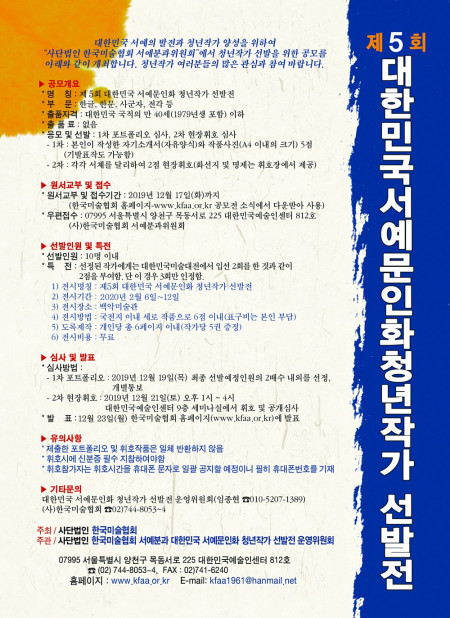 제5회 대한민국서예문인화청년작가 선발전-대한민국 서예의 발전과 청년작가 양성을 위하여"사단법인 한국미술협회 서예분과위원회"에서 청년작가 선발을 위한공모를 아…