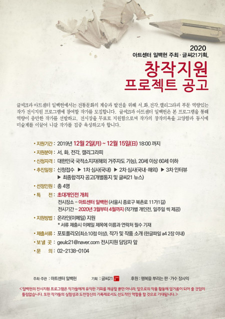 창작지원 프로젝트 공고글씨21과 아트센터 일백헌에서는 전통문화의 계승과 발전을 위해서,화,전각,캘리그라피 부문 역량있는 작가 전시지원 프로그램에 참여할 작가를…