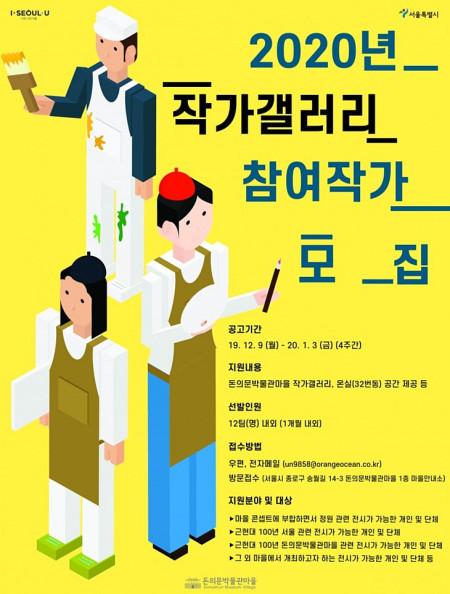 2020 돈의문박물관마을 작가갤러리 참여작가 모집-돈의문박물관마을 작가갤러리에서2020년 참여작가를 모집합니다.자세한 내용은 링크를 확인하세요.