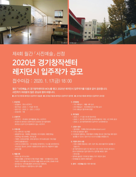 제4회 월간 「사진예술」 선정, 2020년 경기창작센터 레지던시 입주작가 공모월간 「사진예술」이 경기창작센터와 MOU를 맺고 2020년 레지던시 입주작가를 공모…
