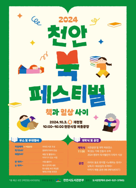 2024 천안 북페스티벌-일시 : 2024년 10월 3일(목) / 개천절장소 : 천안시청 버들광장-퓨전 클래식 4중주, 개막기념 대붓 퍼포먼스,영유아 독서챌린지…