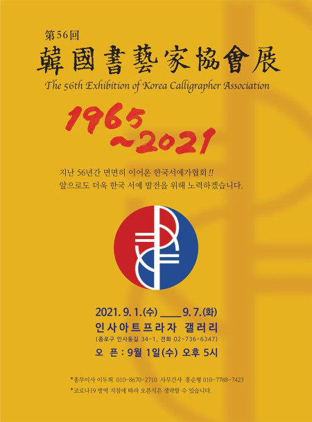 제56회 한국서예가협회전-기간 : 2021. 9. 1(수) ~ 9. 7(화)장소 : 인사아트프라자 갤러리 (서울 종로구 인사동길 34-1)