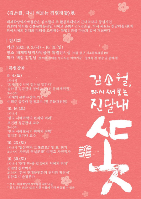 김소월, 다시 써보는 진달래꽃 展-기간 : 2021. 9. 3.(금) ~ 10. 31.(일)장소 : 배재학당역사박물관 특별전시실 /서울특별시 중구 서소문로…