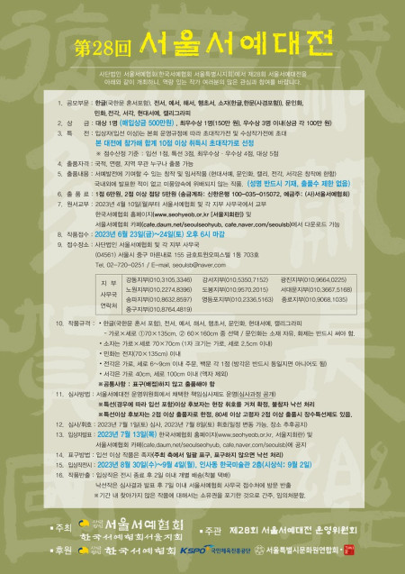 제28회 서울서예대전-한글(국한문 혼서포함) • 전서 • 예서 • 해서 • 행초서•소자(한글,한문(사경포함))민화 • 문인화 • 전각 • 서각 • 현대서…