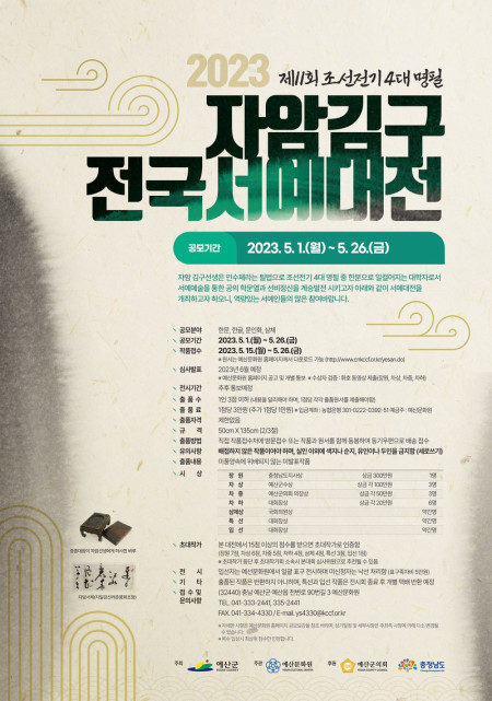 제11회 자암김구 전국서예대전-2023년 5월 15일(월) ∼ 5월 26일(금)직접 방문 접수 또는 작품과 원서를 함게 동봉하여 등기우편으로 접수(32440)…